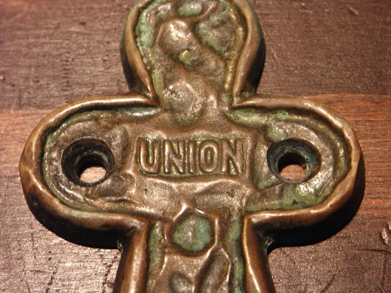 上下はクローバー型、ハンドル自体はねじれたデザイン、全体的には凹凸模様で個性的です。もともと緑青がはえたような緑っぽい色の「汚し」塗装です