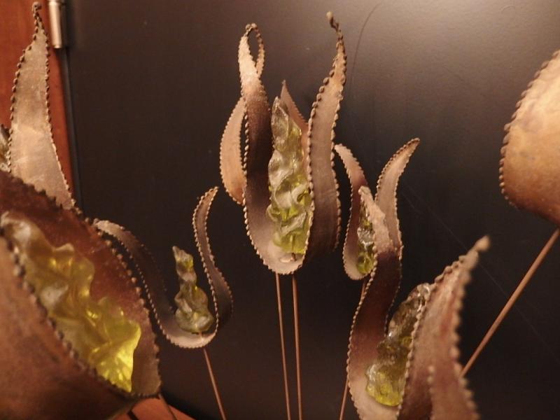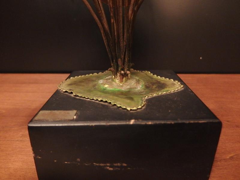 黒塗装された木ベースから真鍮、銅を使用し形造られた植物モチーフのオブジェ。