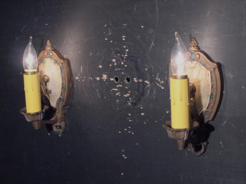 クラシックなデザインの鉄製古色ウォールランプ1灯のペア。