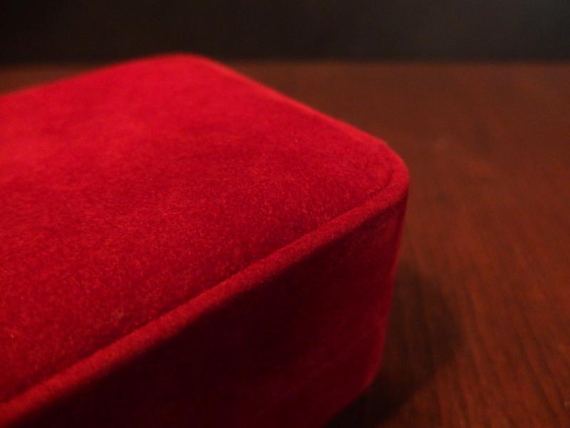 外装も内身も赤いモケット起毛のある布が貼られています。