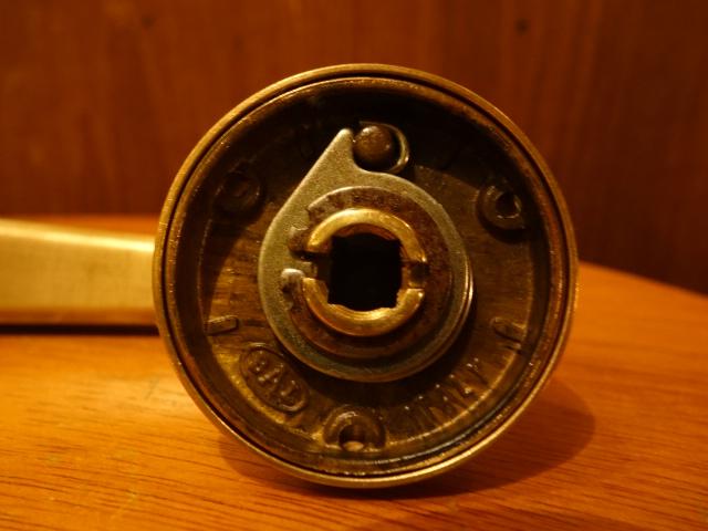心棒用の四角い穴があり、ハンドル自体は90°近くまで時計回りに回り、バネの作用で戻ってきます。